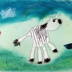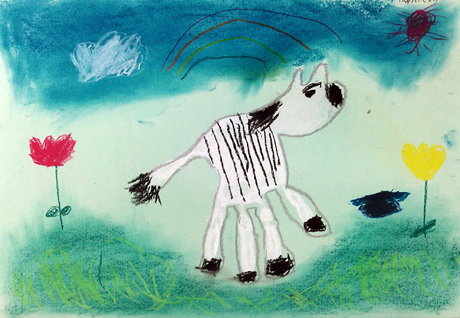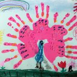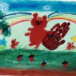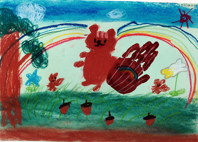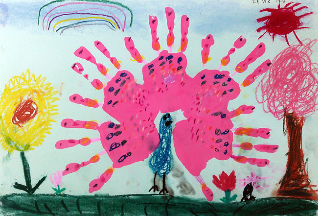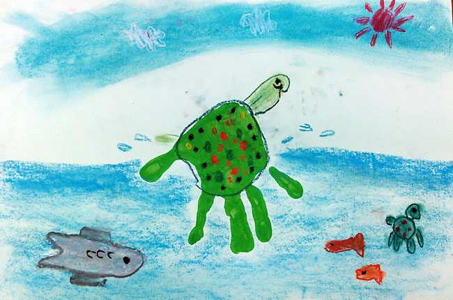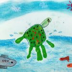 スタンプした手がたを使って、生き物の絵を描きました。コンテパステルを使って擦ったり描き足したりしながら、周りの情景を描き入れ、面白い作品に仕上げましょう。