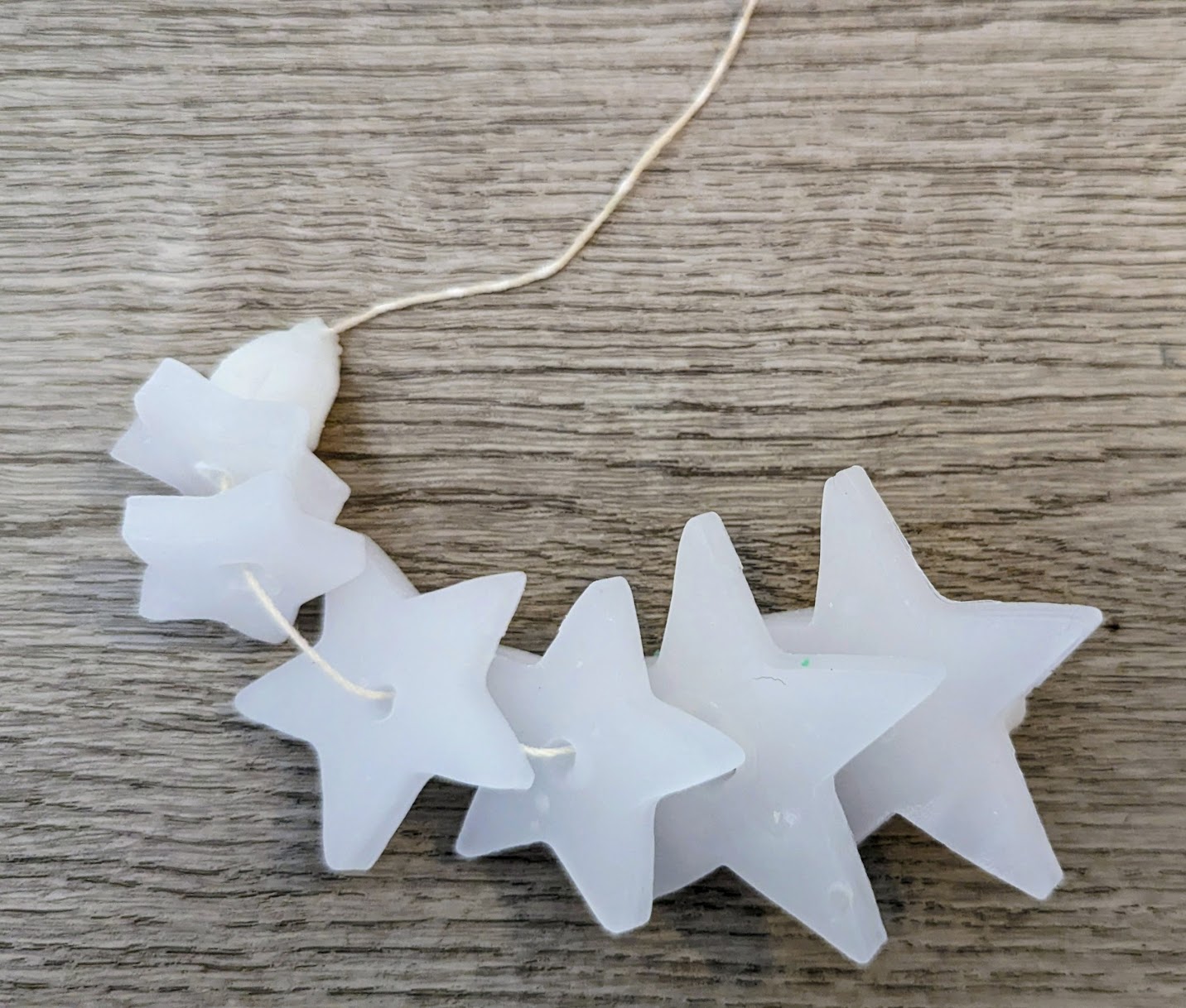 あらかじめ型抜きした星型のロウパーツを紐に通し、溶けた緑色のロウに何度も浸して大きくし、ツリー部分を作ります。