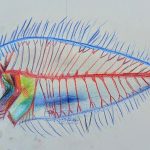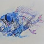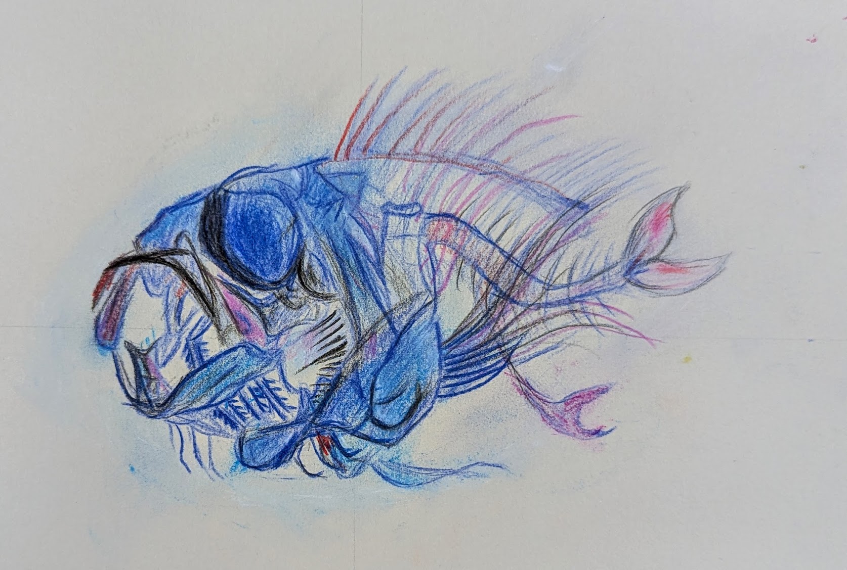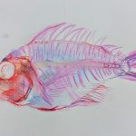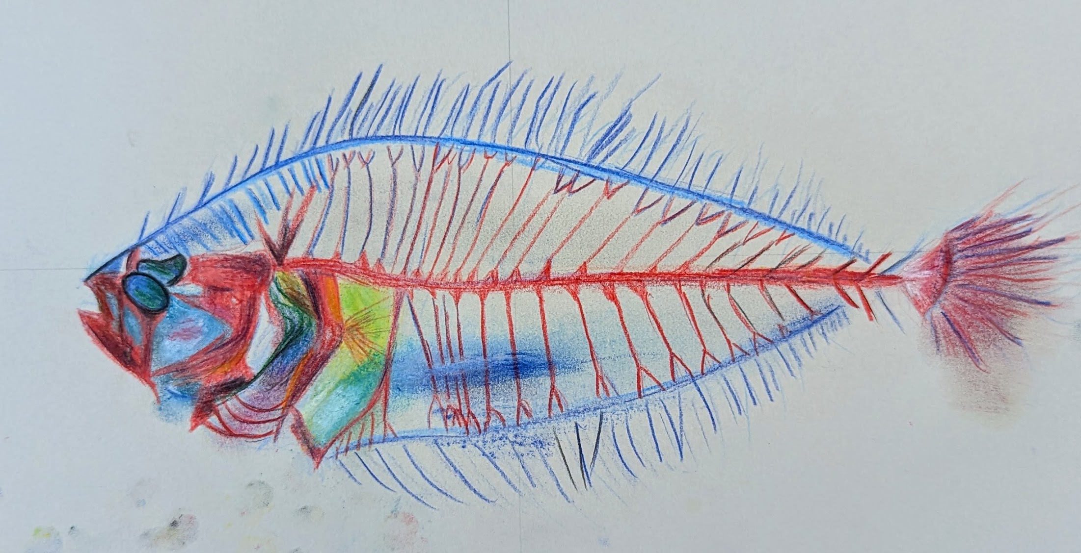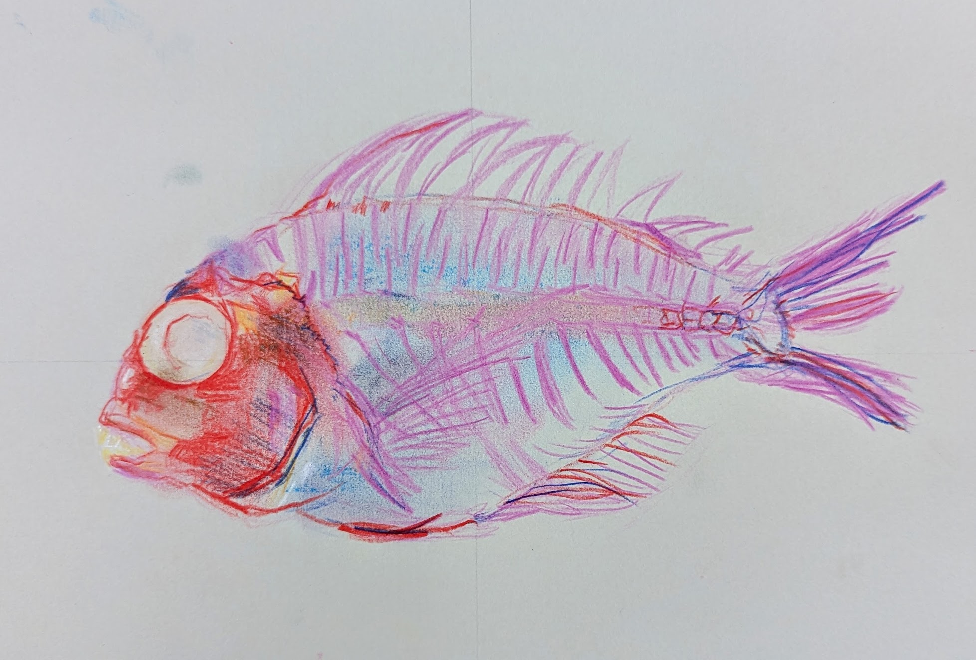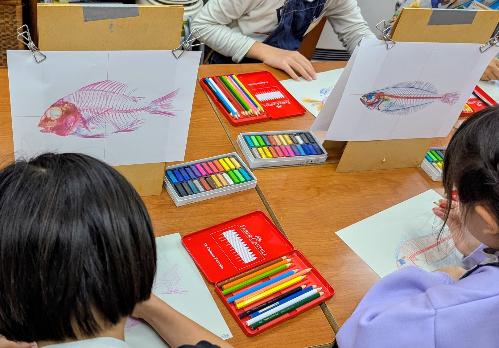 パステルとい色鉛筆を使って、魚の透明骨格標本を描きました。 参考写真と細かく見比べて、繊細で不思議な魚の絵を仕上げましょう。