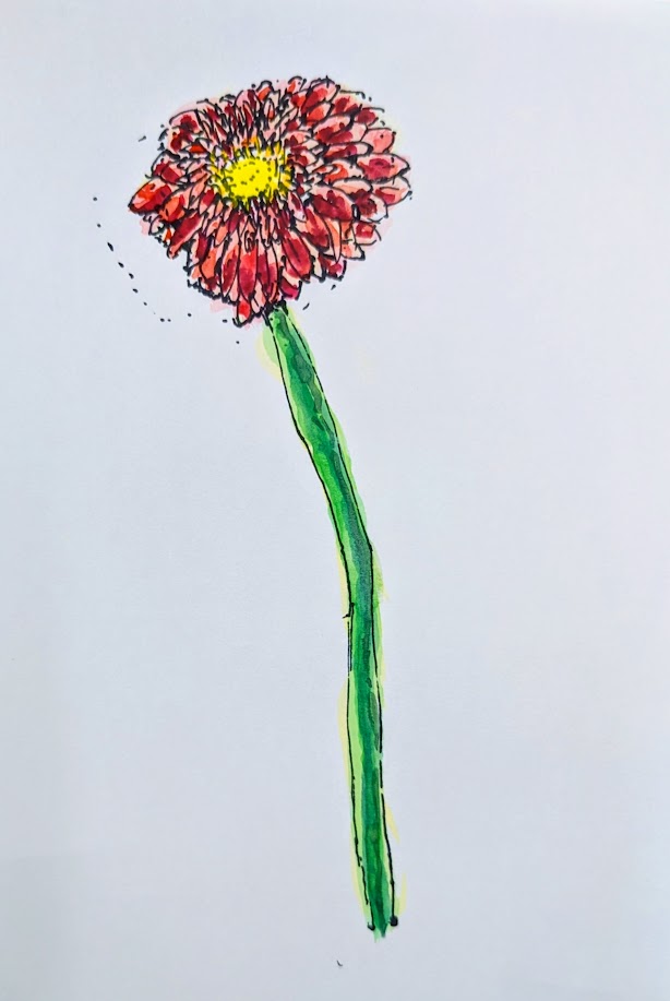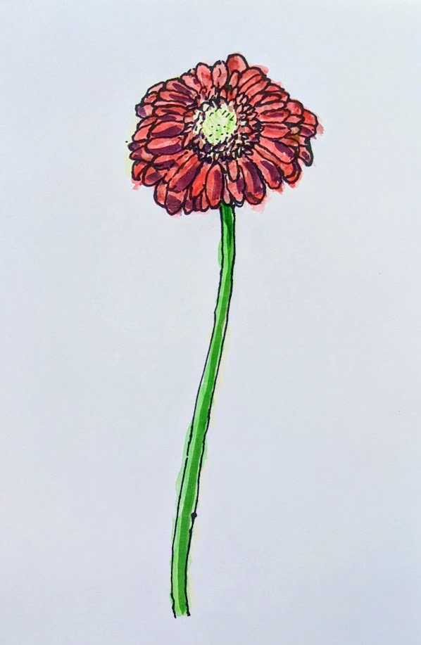 ガーベラの花をよく観察してサインペンで描き、水彩絵の具で色を付けました。 花びらの向き、大きさ、茎の太さなど気を付けながら描き、色を重ねて表現しています。